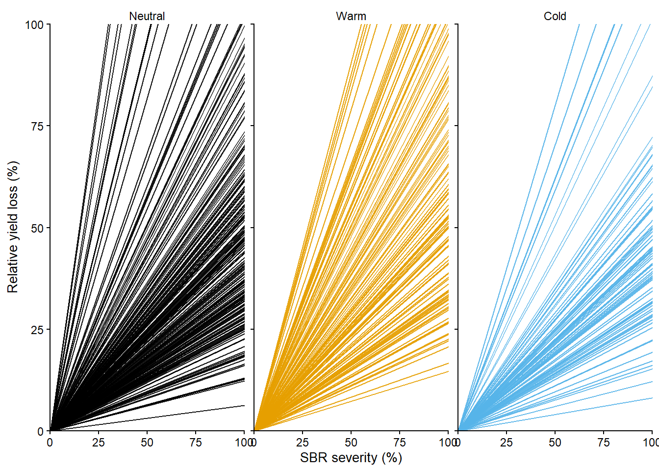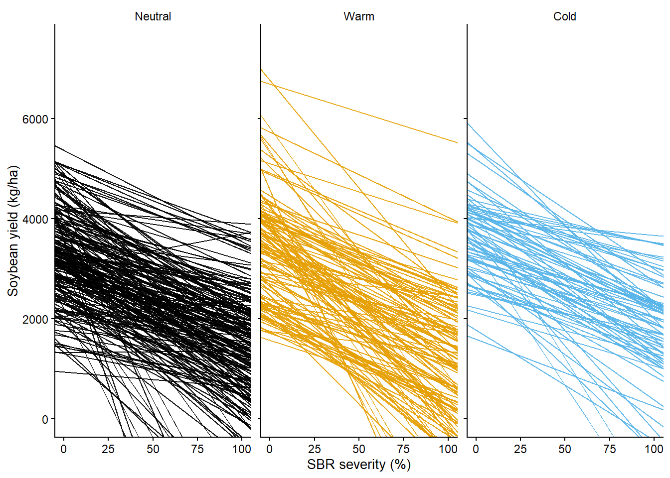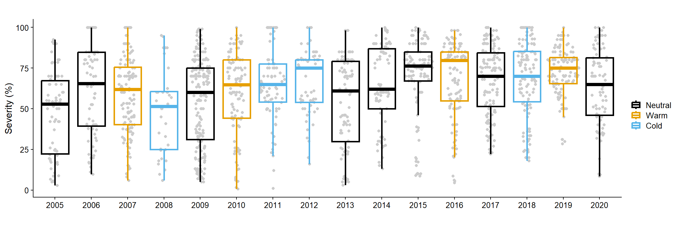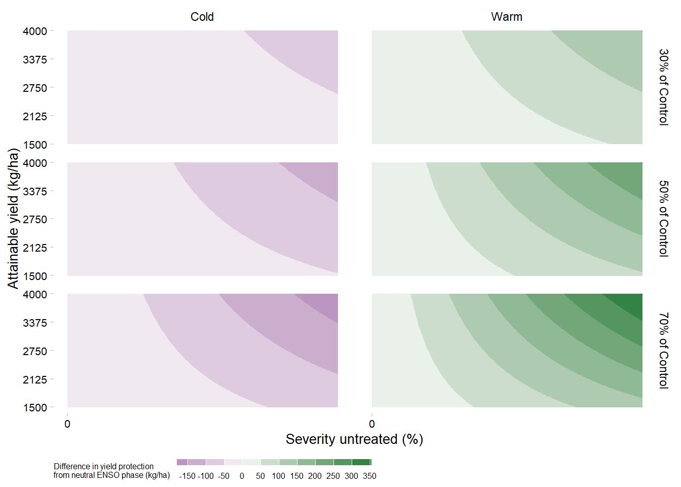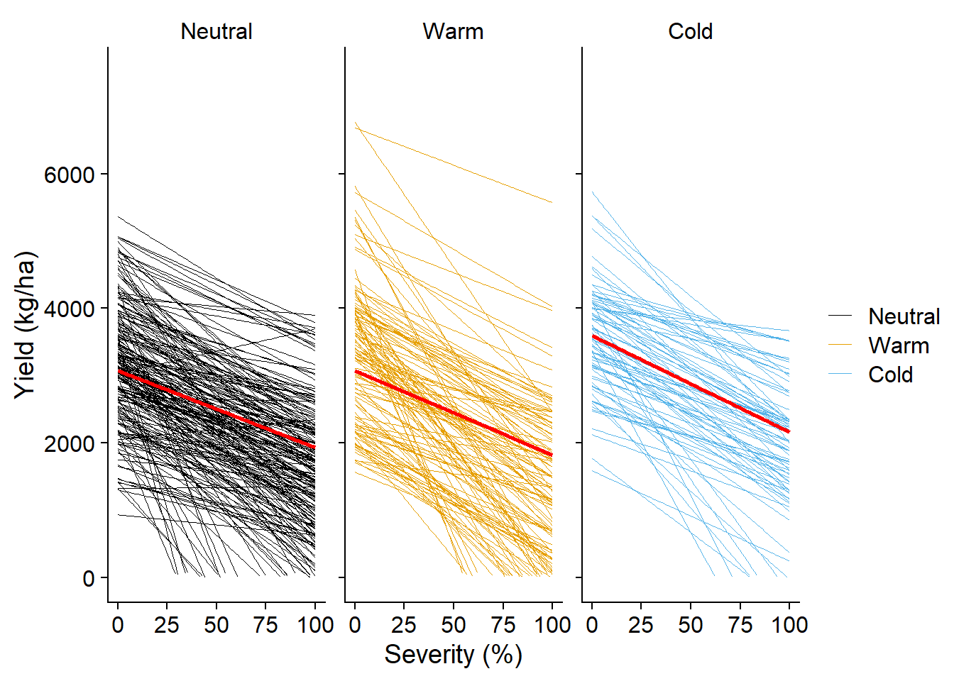 - Estimate disease damage coefficients (i.e., the relationship between disease severity and yield loss) under different ENSO phases (warm, Neutral, cold).