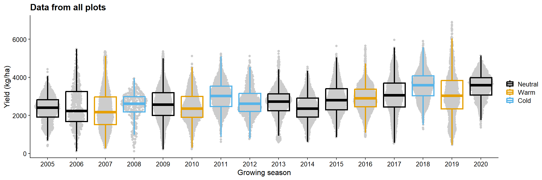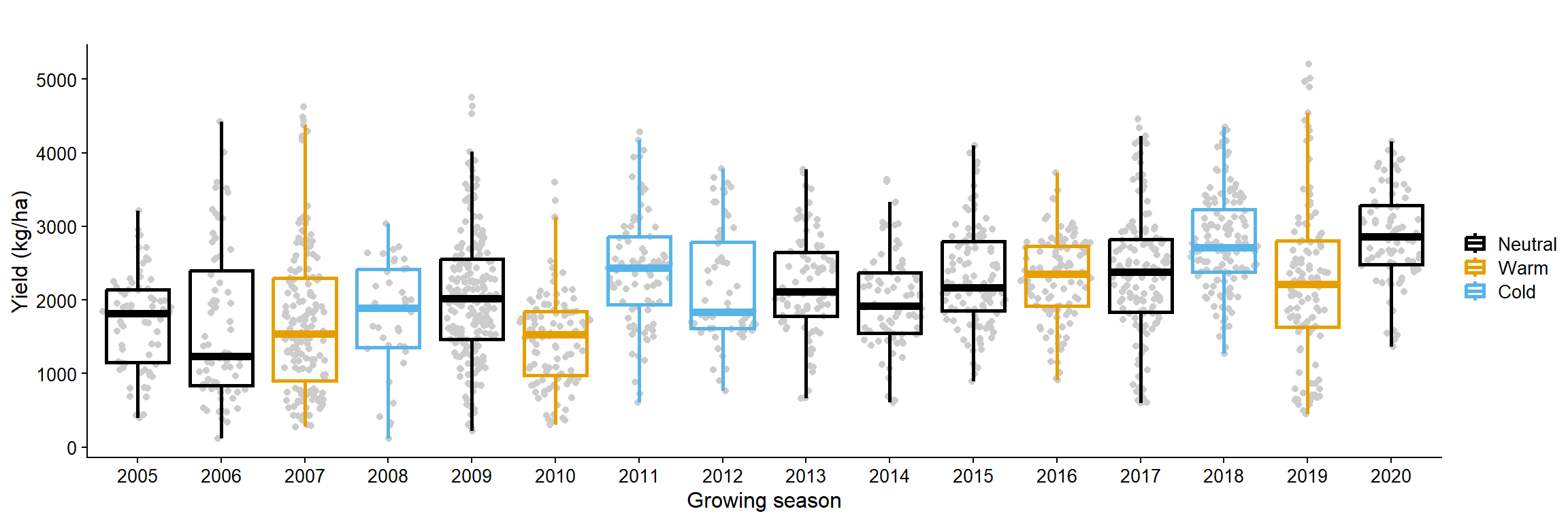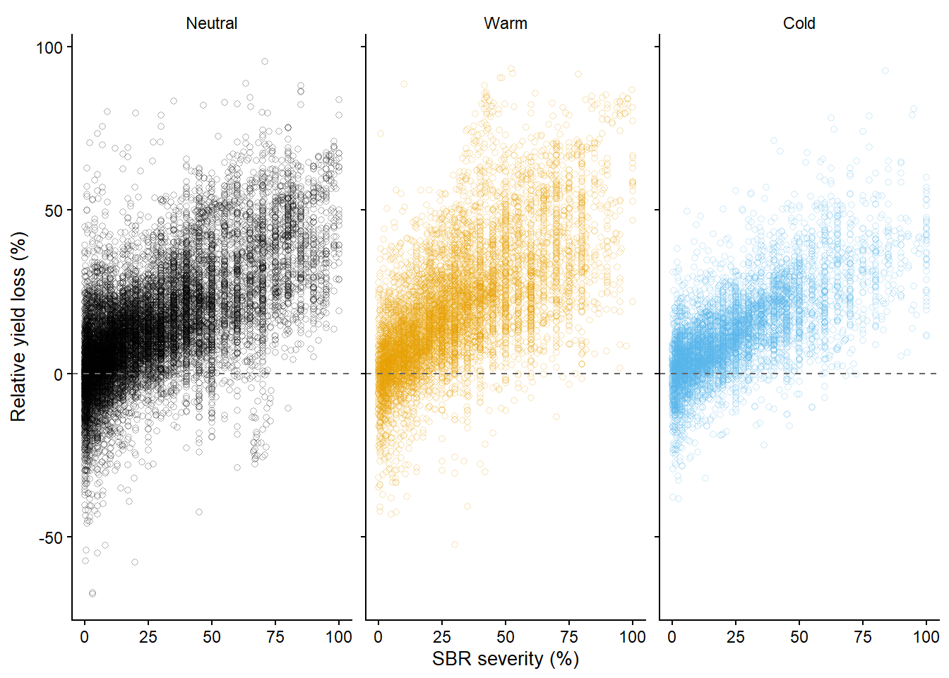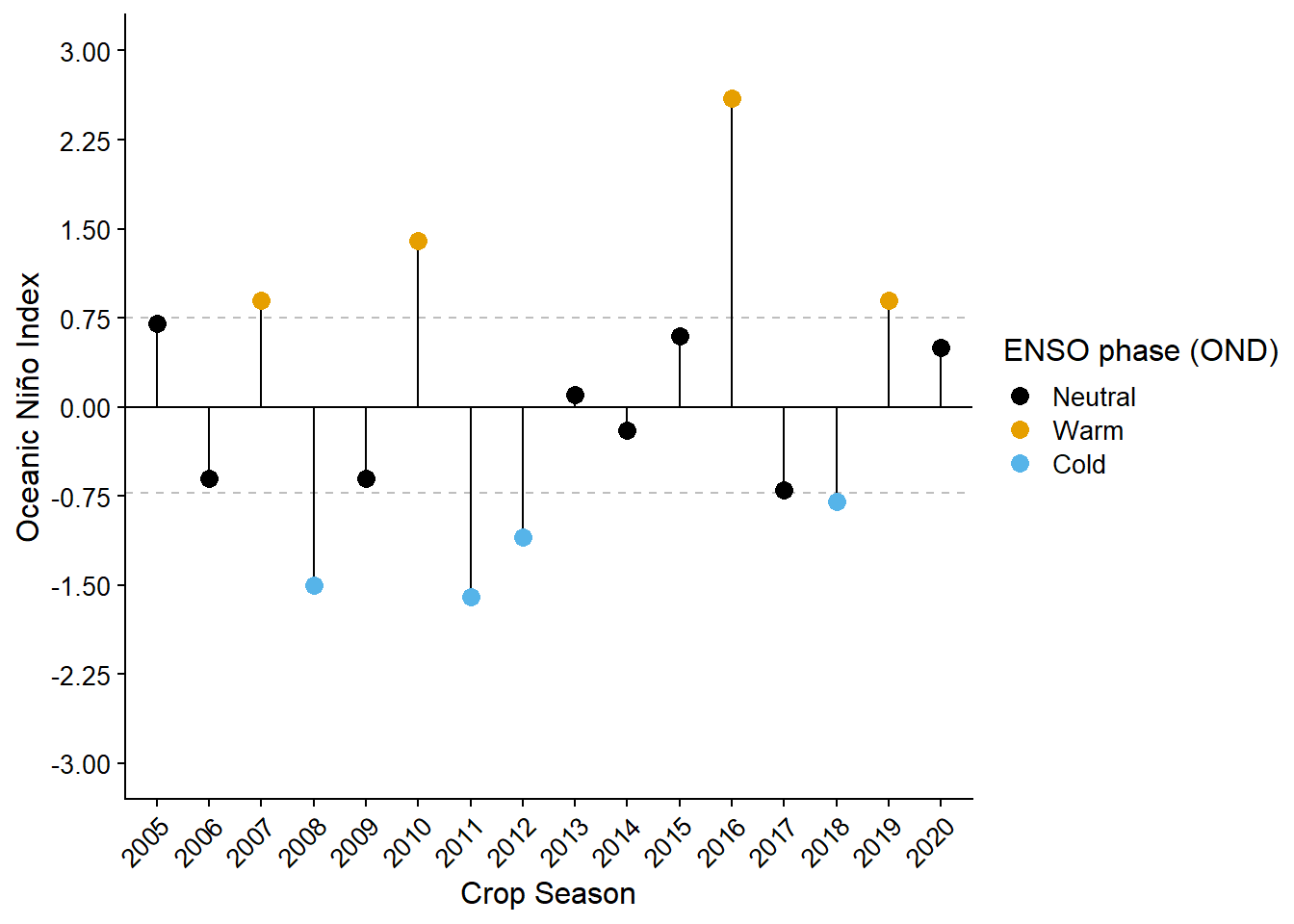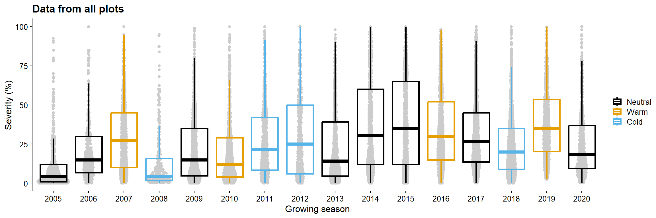 - Estimate disease damage coefficients (i.e., the relationship between disease severity and yield loss) under different ENSO phases (warm, Neutral, cold).